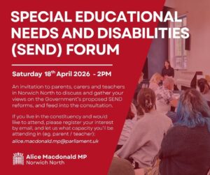 Alice’s office is holding a Special Educational Needs and Disabilities Forum on Saturday 18th April, following the Government’s proposed SEND reforms.